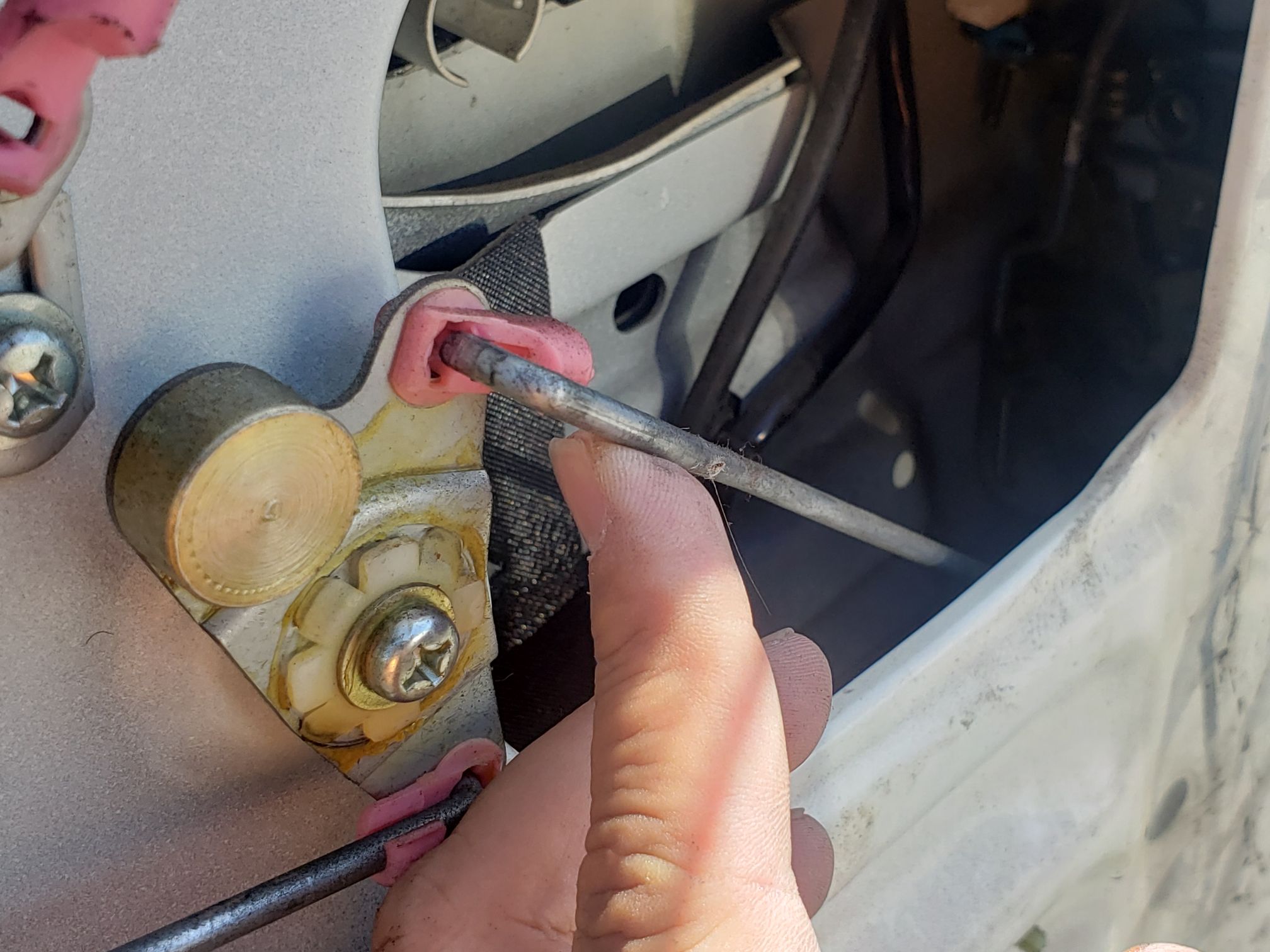 After taking off the door card or panel, go to where the handle is located.