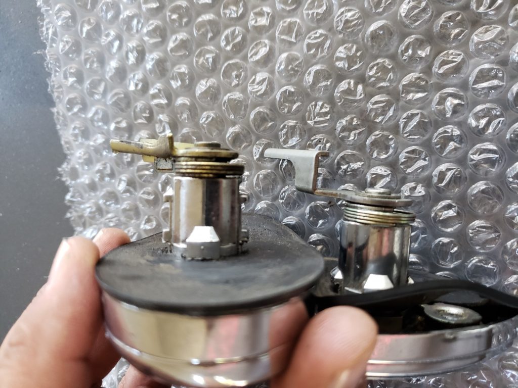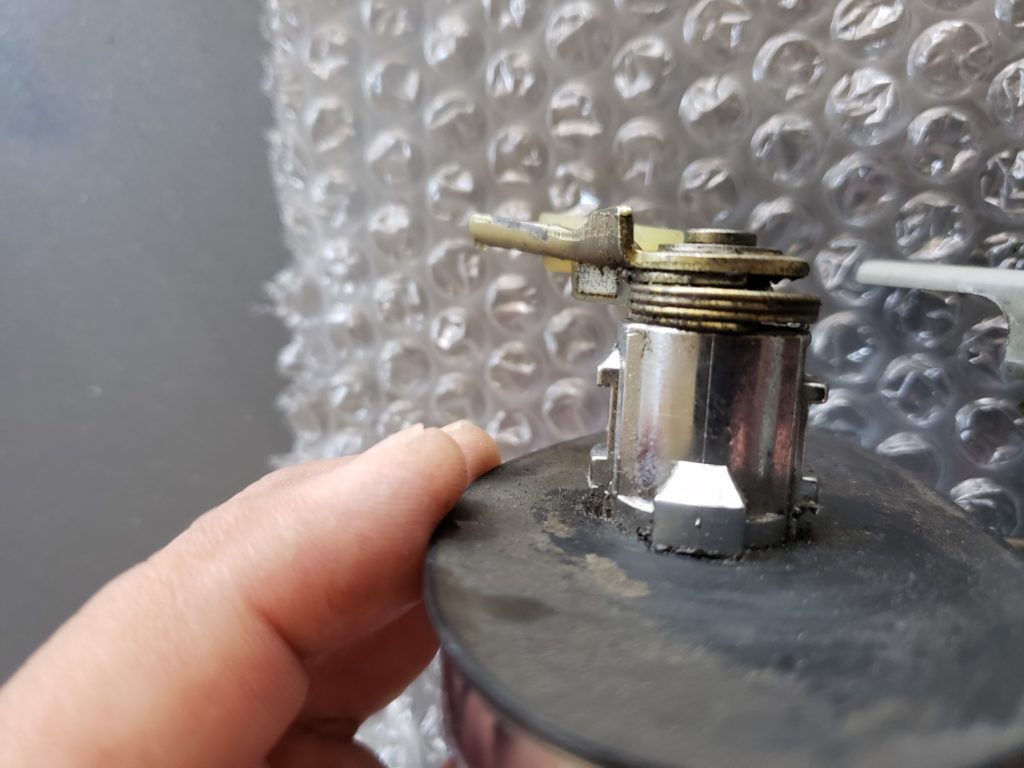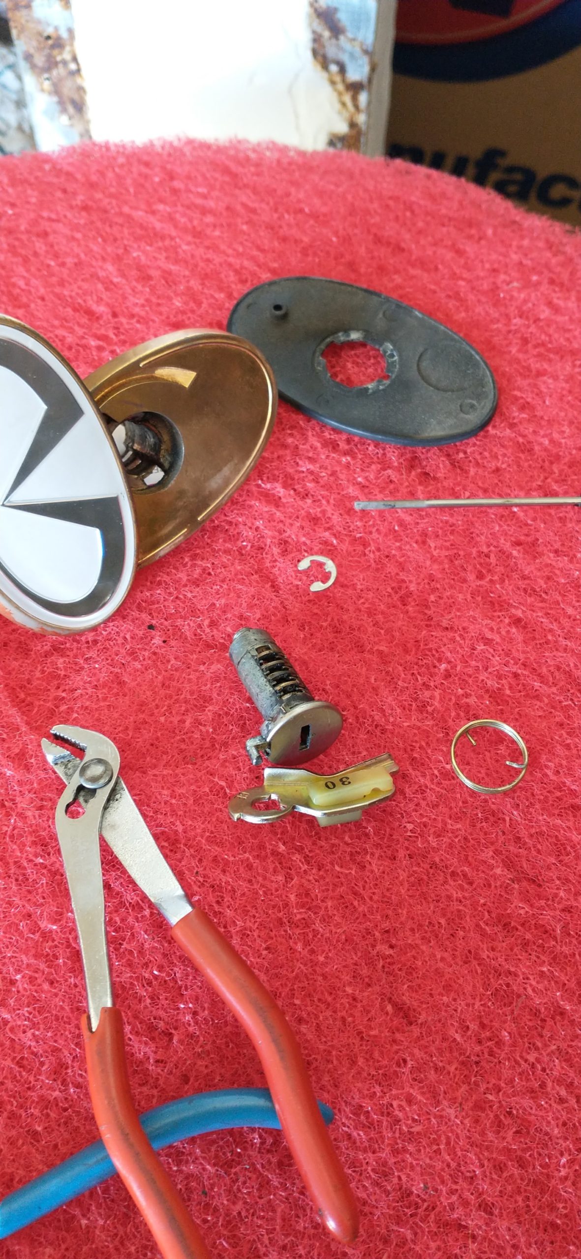 - then side the emblem off to the side and from behind, use a punch or screw driver to pound out the key cylinder.